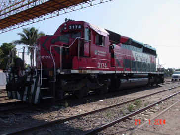 En fin, ya al llegar a la estación de Roseta (Km. 1437.7) comienza una topografía muy regular y plana. Las pendientes máximas son muy cortas y no sobrepasan los 0.5% grados. De ahí hasta Mazatlán, el ambiente es más cálido. Por su parte, la hidrografía es muy interesante. El Río Santiago acompaña incesante el trayecto de la vía, por un espacio de tiempo considerable. De Tepic hasta la estación Yago (Km 1407.2), los avistamientos del cause del rió son intermitentes pero constantes. Pasando Roseta, el Santiago, se muestra menos tímido y se deja ver más a menudo. No cabe duda que la temporada de aguas de 2003 fue muy intensa y, así lo dejan ver los “playones” que ahora quedan al descubierto pero que meses atrás, estuvieran a más de tres metros de profundidad en el lecho del río. Conforme avanzamos, la compañía del Santiago es más constantemente hasta que cansado de seguirnos, nos abandona pasando debajo del puente cercano a la estación Yago. De ahí, continua solo su camino hacia la desembocadura en el Pacífico. No obstante, el agua y humedad que ha dejado a su paso, han hecho de esas tierras Nayaritas, fértiles lechos para infinidad de flora tropical y semitropical, hasta llegar a las palmeras típicas de la costa. En la siguiente estación, Ruíz, tuvimos que detenernos. Originalmente era para esperar el encuentro del Dirécto de Sufragio-Guadalajara, que ahí llegó a eso de las 12:00 horas. Yo diría que "providencialmente", nuestro arribo como a las 11:15 horas fue "ni mandado hacer" pues habiendo partido temprano y sin desayunar, para esas horas nuestros estómagos parecían jauría de perros en "plena pelea". Lo curioso fue percatarnos que el "Directo" iva encabezado por la AC4400 4528, seguida de tres C30-S7R, entre las que destacaba la 3766. E insisto, es raro por que aunque no pude percatarme si las tres C30-S7R ivan solo en "holgar" o, si ivan remolcadas y cotroladas en "multiple" por la AC4400. Se debe considerar esto como desusual y muy importante por que de acuerdo a las políticas de Ferromex, ninguna otra locomotora que no sea una AC4400, puede ir acoplada y operada "en múltiple" con otras AC4400. Según tengo entendido, esto se debe a que la operación en múltiple de locomotoras AC y DC no es compatible. Yo en lo personal agregaría que, la relación de engranes es distinta, principalmente por lo que a los trucks de alta adherencia de las AC4400 se refiere. No obstante, en los Estados Unidos, he sido testigo en varias ocasiones de diferentes de tipos de locomotoras tanto AC y DC que indistintamente, van acopladas en múltiple y, operadas como "unidades guiadas", trabajando simultáneamente.